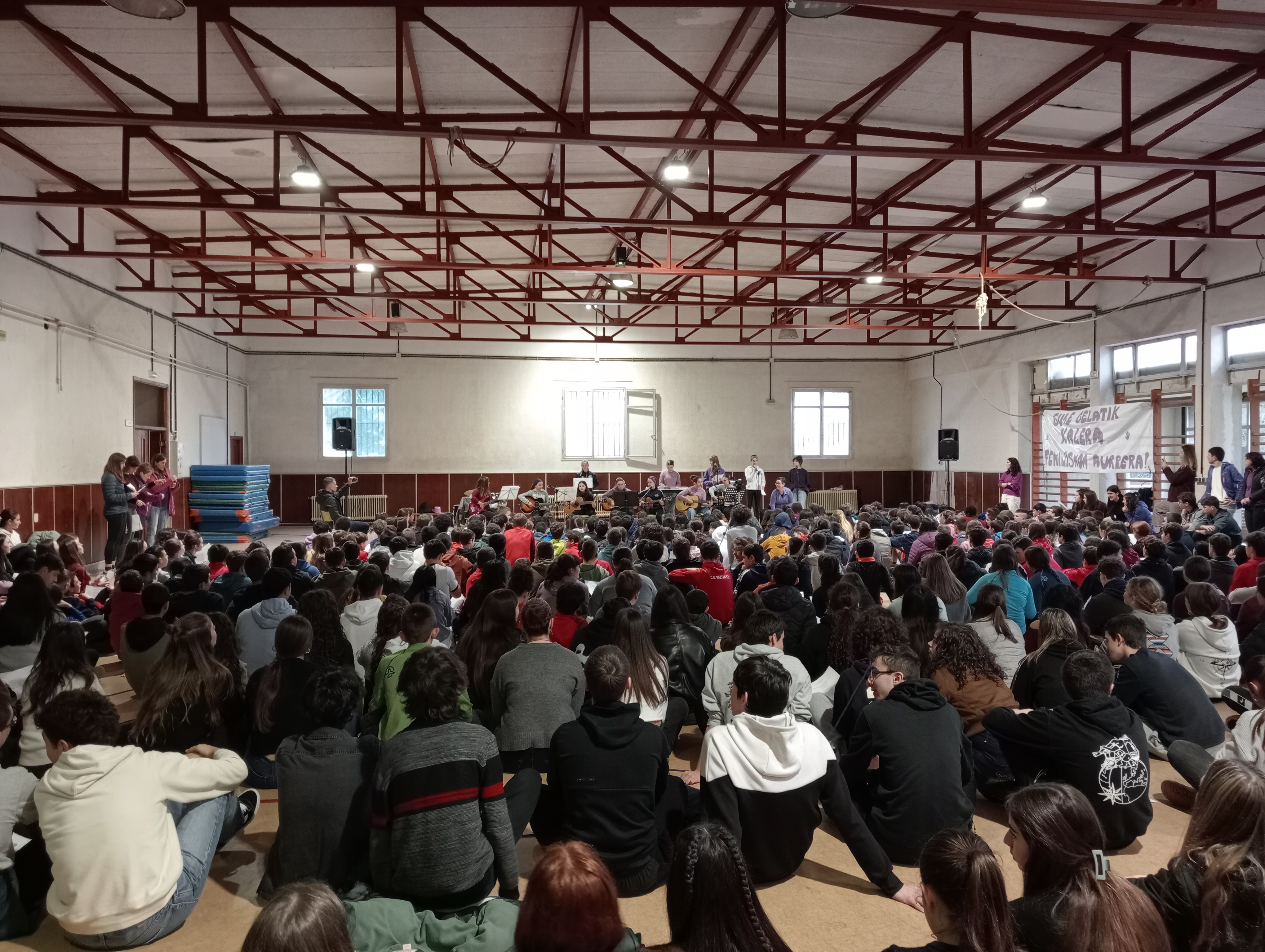 El programa preparado se ha desarrollado entre los dos recreos, con la participación activa del alumnado. En primer lugar, los estudiantes han acudido de manera ordenada al gimnasio, donde comenzaron las actividades. A continuación, se ha realizado el “juego del hilo”, una dinámica en la que se han ido leyendo distintas frases. Después, una actuación musical que ha ambientado el encuentro y, para finalizar, se ha llevado a cabo una lectura feminista en la que se destacaron mensajes sobre los derechos de las mujeres, la igualdad y la importancia de seguir construyendo una sociedad más justa.