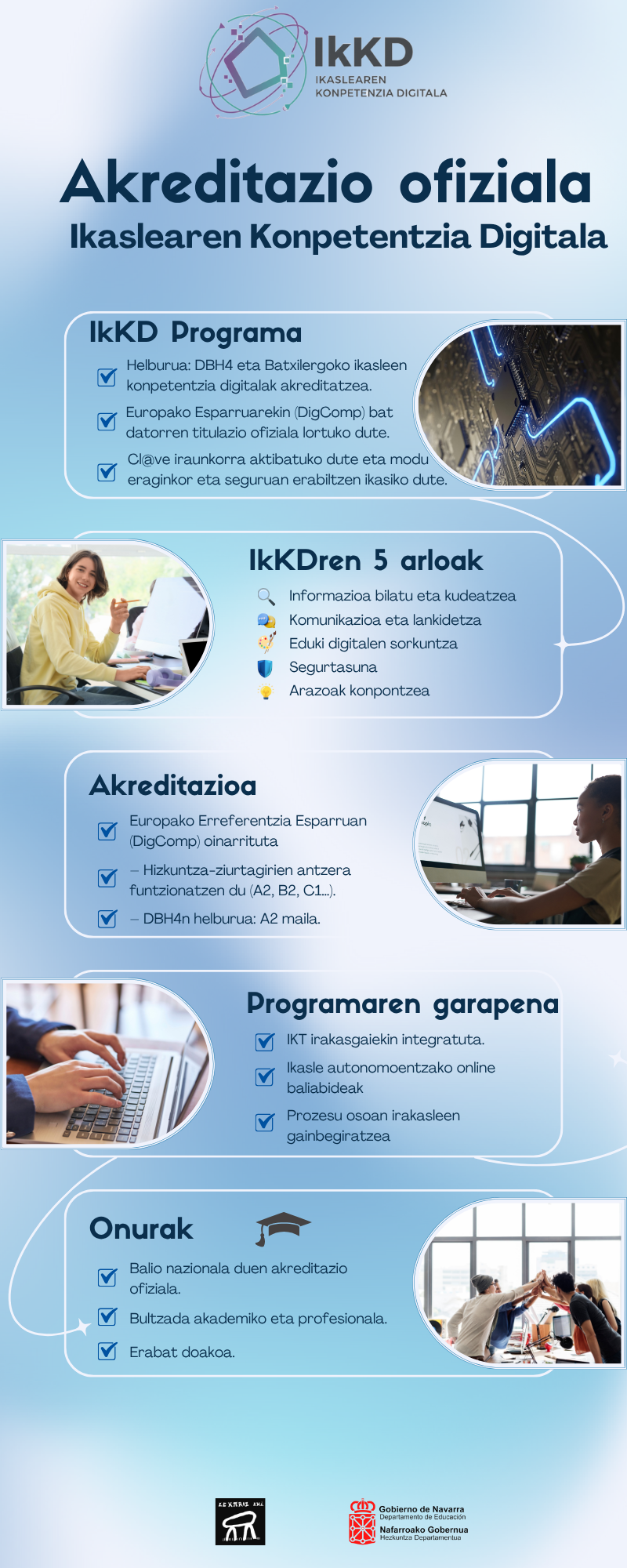 2025-2026 ikasturtean, gure ikastetxeak Ikaslearen Konpetentzia Digitalaren Akreditazio (IkKD) programaren pilotajean parte hartzen du, Hezkuntza Departamentuko ikasNOVAren eskutik eta Aurrerapen Digitalaren Zerbitzuarekin elkarlanean (Nafarroako Gobernua). Ekimen honen helburu nagusia da DBH4ko eta/edo Batxilergoko ikasleek beren trebetasun digitalen akreditazio ofiziala lortzea. Pilotaje fasean egon arren, ikasleek materialekin euskaraz lan egingo dute, eta akreditazio-proba euskaraz eskaini ahal izateko lanean ari gara.