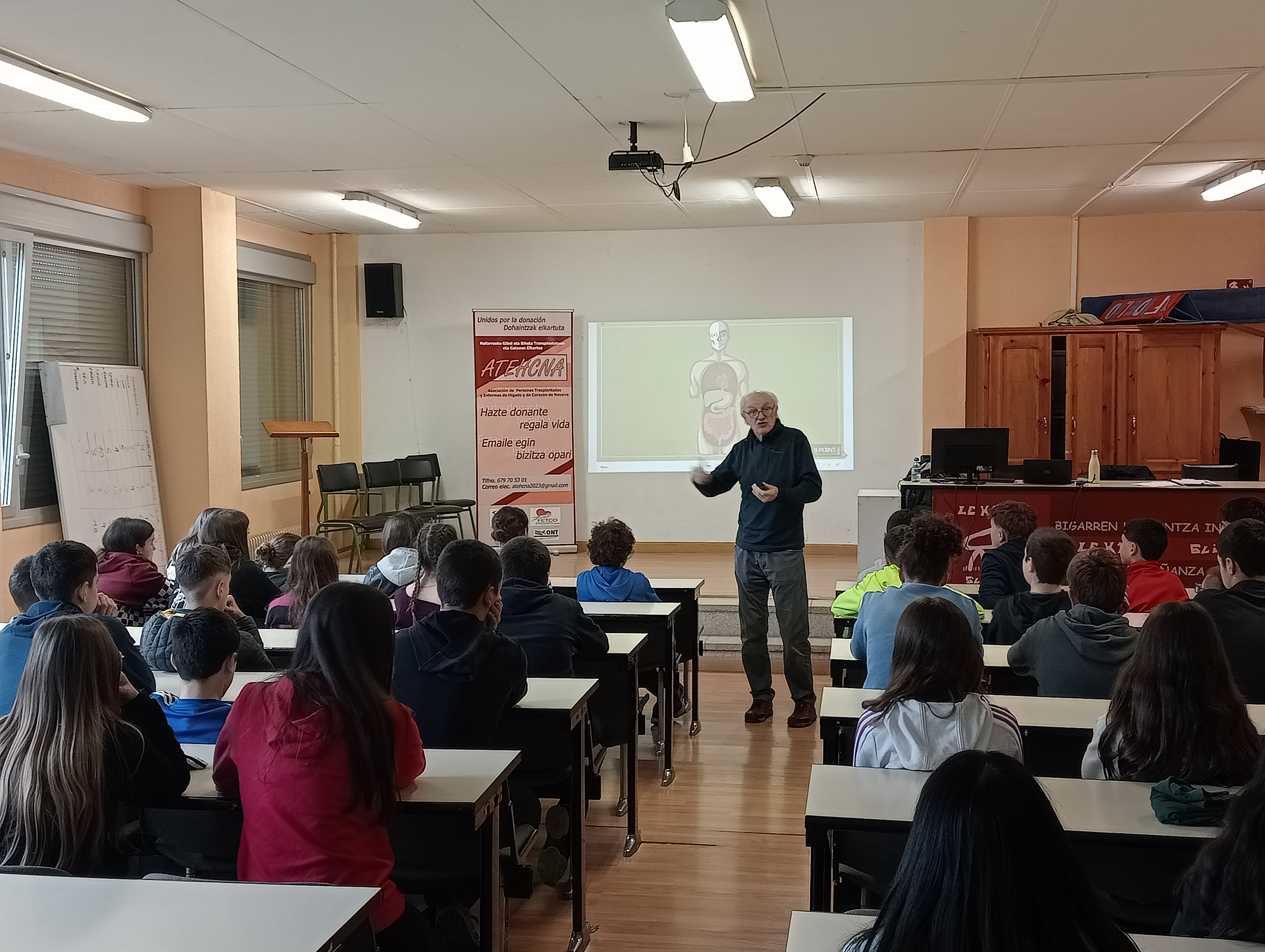 Biologia eta geologia departamendutik organoen donazioaren inguruko hitzaldia antolatu da 3. DBH -ko ikasleentzat. Hitzaldia ematera ATHECNA elkartetik (Asociación de Personas Trasplantadas y Enfermas de Hígado y de Corazón de Navarra), Fernando eta Juanje etorri zaizkigu, biek ere elkarteko kideak; lehenengoa zuzendaria eta bigarrena gibeleko trasplantea jasotako kidea. Bien artean organo transplanteak zer diren, egoera orokorra eta organo emaile izatearen garrantzia azaldu digute.